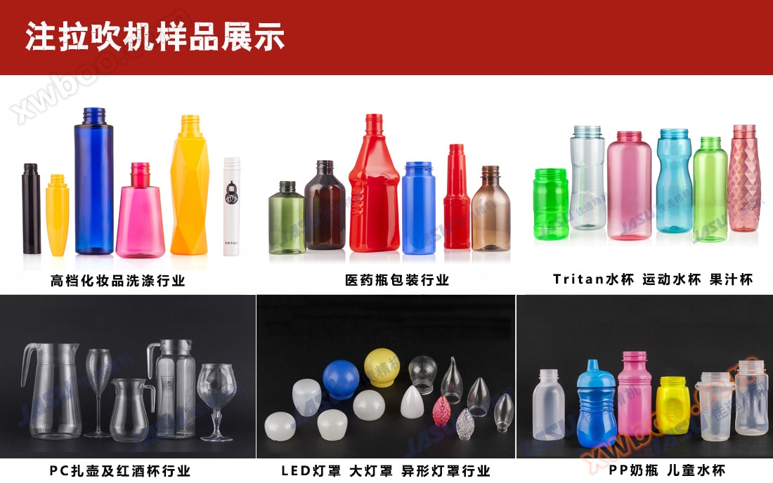■Maszyna do dmuchania butelek ISB 800N-3 jest stosowana w szerokim zakresie, dostępnych jest wiele rodzajów surowców, w tym produkty z serii PC / PMMA / PP / PET / PS / Tritan, w tym: osłony LED, żarówki PC, kubki kosmiczne, czajnik, butelki do napojów, pojemnik wewnętrzny; Seria PET obejmuje: butelki kosmetyczne, butelki na leki, butelki szerokoustne, opakowania na żywność, butelki na napoje; Seria PP obejmuje: butelki do mleka, butelki do wody, czajniki, opakowania spożywcze i inne. Produkty produkowane przez maszynę do dmuchania butelek ISB 800N-3 w jednym kroku nie mają latających krawędzi, braku wody, mniej wad, mają doskonałe usta, dno i szwy zaciskowe, mają większą przejrzystość i większą sztywność.