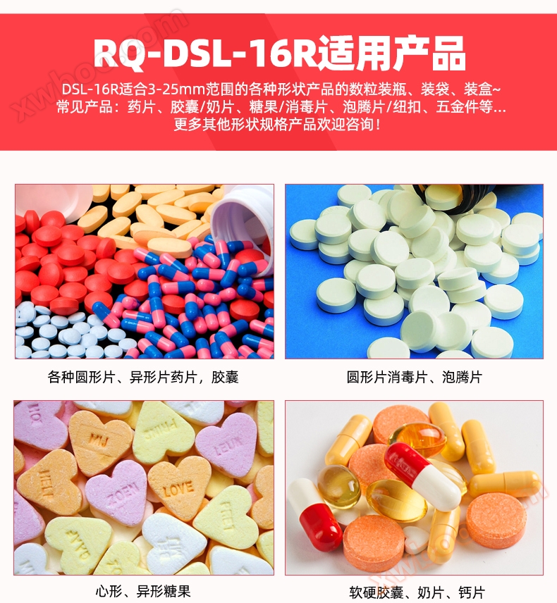 DSL-16R jest innowacyjnym produktem szóstej generacji mojej firmy Guangdong Ricky. Naukowa konstrukcja modułowa zbiornika oscylacyjnego, pneumatycznego mechanizmu ciągłego podawania itp. Liczenie modułów optoelektrycznych z niezależnym sterowaniem jeden na jeden, wysoka dokładność i szybkość. DSL-16R może liczyć opakowania różnych tabletek i kapsułek 3-25 mm (twarde kapsułki, miękkie kapsułki, tabletki, tabletki itp.). Zgodny z normami GMP, nadaje się do kilku opakowań produkcyjnych w szpitalach, fabrykach farmaceutycznych i fabrykach produktów zdrowotnych.